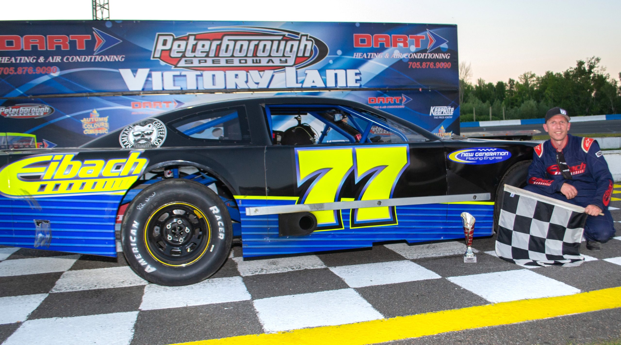 A week after his son Chase took the Jr. Late Model win Brad Stevenson (No. 77) claimed the KOD Disposal Super Stock checkered flag – Saturday, July 16th – at Peterborough Speedway.