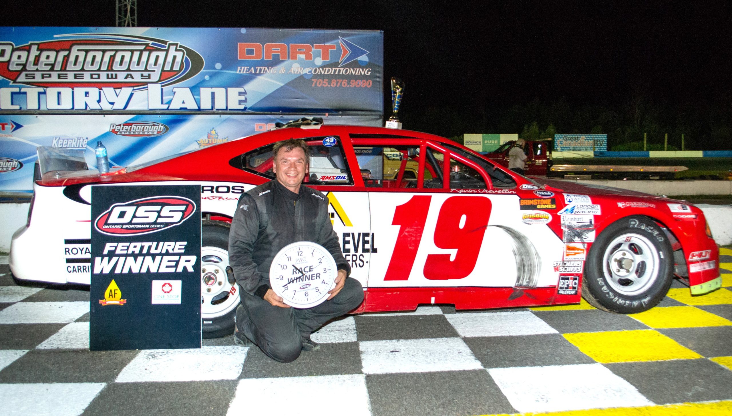 It was an Ontario Sportsman Series trifecta for Kevin Trevellin, who set fast time in qualifying, started on the provisional pole and led every lap of the AF100, to record his first career main event win. Mark Patrick, Doug Cathcart, Chad McGlynn and Bradley Robinson completed the top 5. Full event details can be found at www.ontariosportsmanseries.ca.