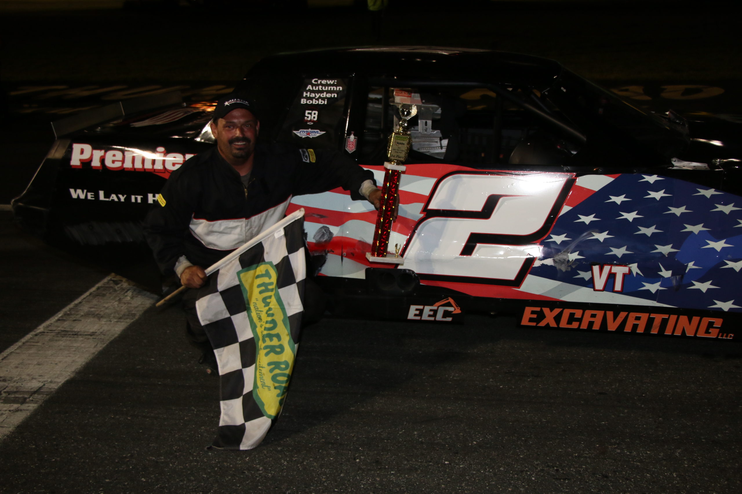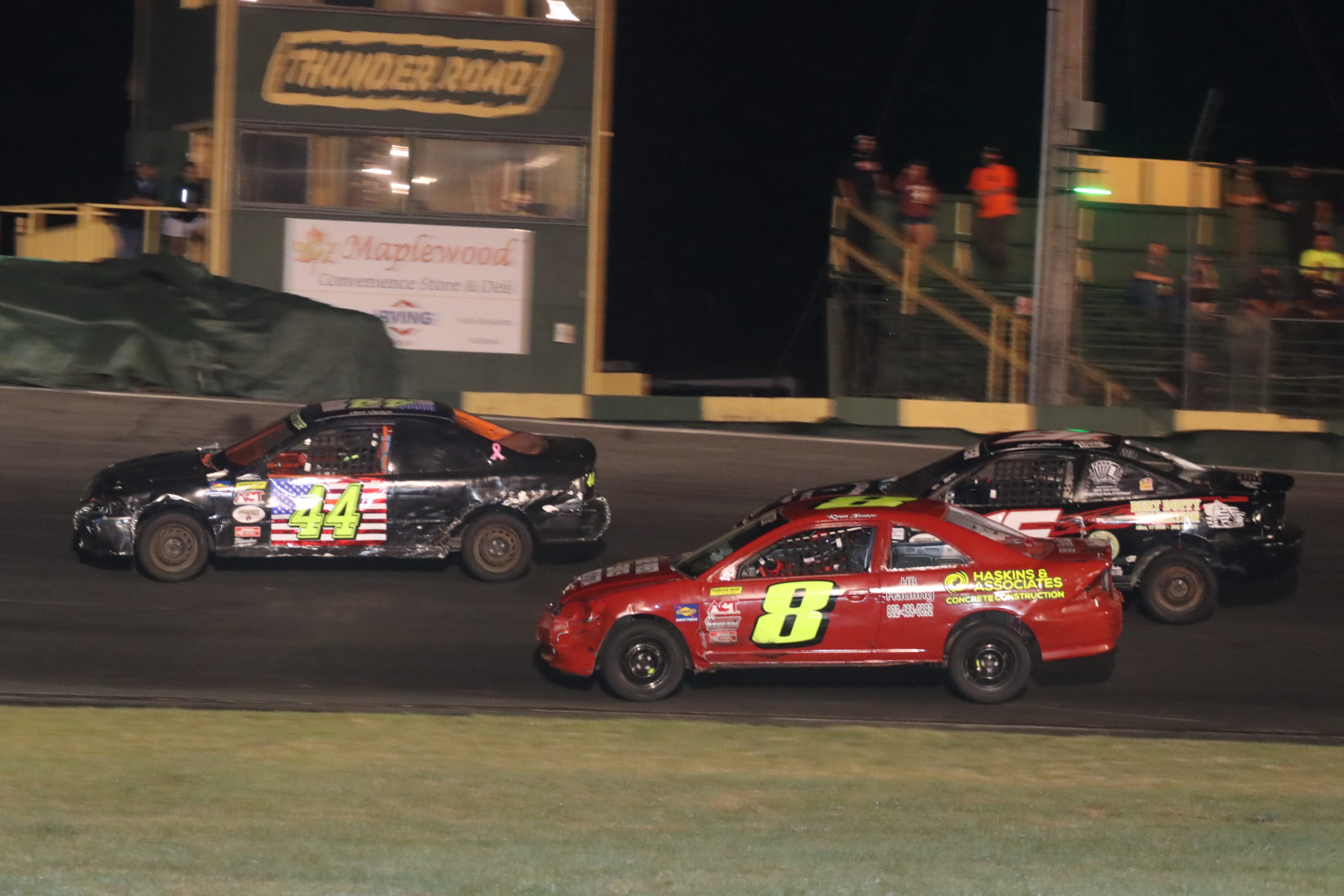The Johnson versus MacAskill battle began all over again on the restart, neither giving each other an inch before Johnson pulled away in the low groove. In the closing laps, MacAskill gave it his all, taking his 3VT Monte Carlo to the extreme outside groove on the straightaways for even the slightest advantage on Johnson to no prevail. Eric Johnson took down his first Thunder Road win of the season followed closely by Michael MacAskill and Tyler Austin. In post race technical inspection, Austin was stripped of the finish with unapproved steering components giving Milton’s Robert Gordon the 3rd-place finish.