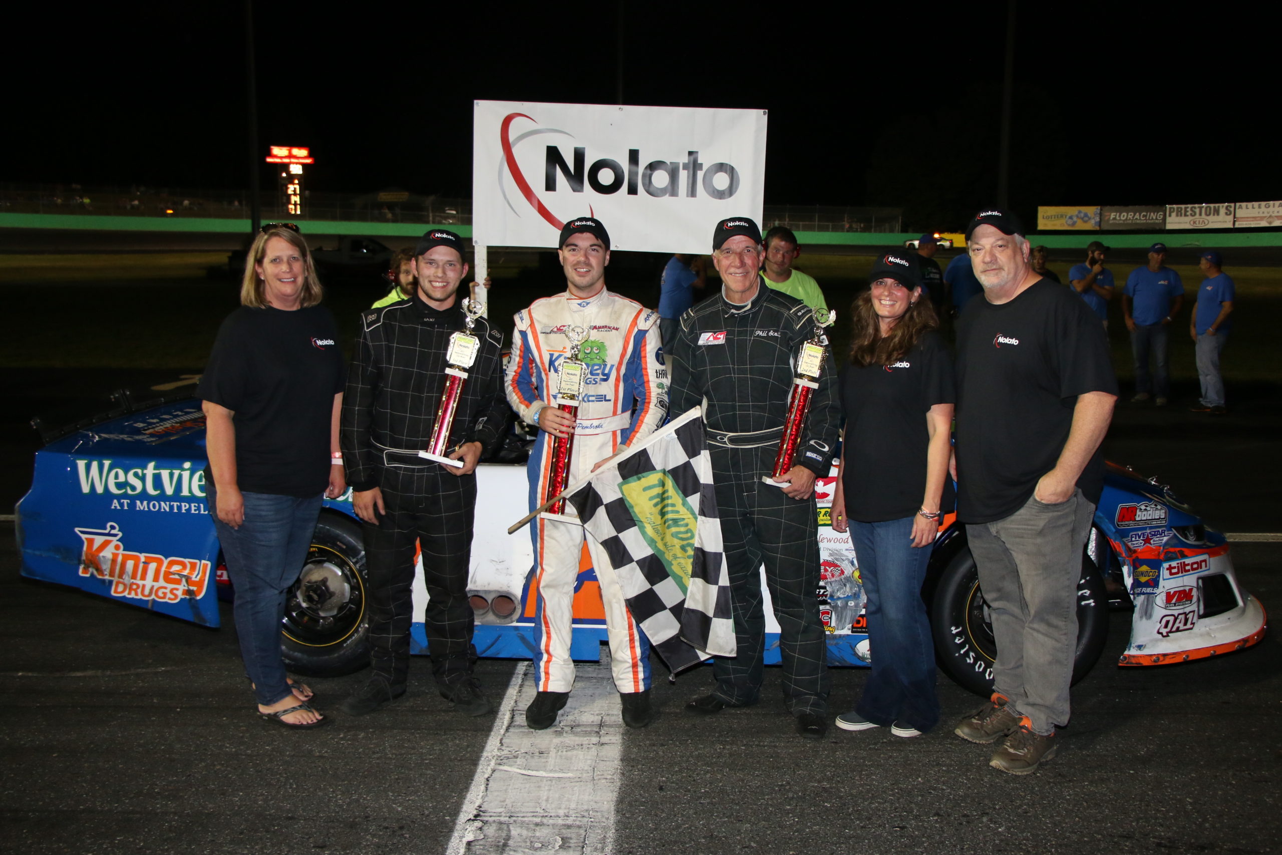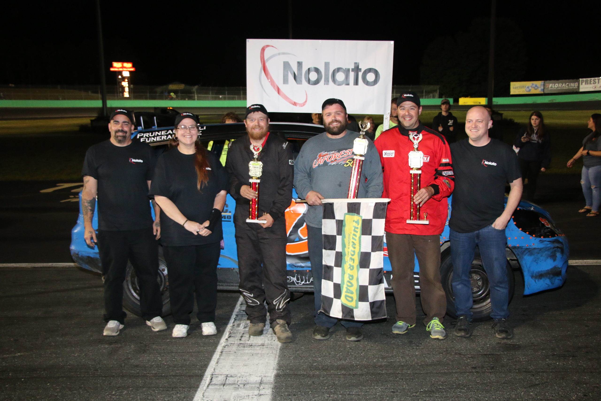 The top-5 lead pack duked it out amongst themselves as they carefully navigated lap traffic on the Thunder Road highbanks. On lap 33, Taylor Sayers punched a hole underneath ‘Creature’ coming out of turn four and it was lights out. Taylor Sayers took down his first Thunder Road victory to the tune of $500 for the Nolato Road Warrior Challenge win followed by Ryan Foster and Nate Brien to round out the podium.