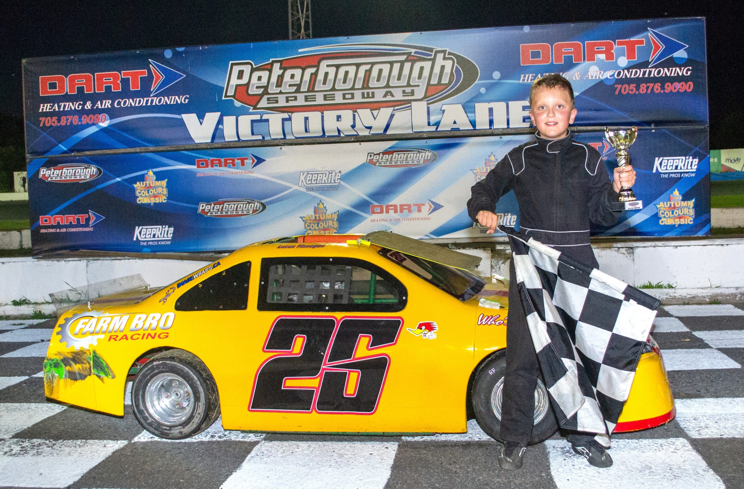 In the crowd-pleasing Kingsway Auto Centre Junior Late Model field it was Lucas Finnegan (No. 26) taking the checkered flag – Saturday, July 23rd – at Peterborough Speedway.